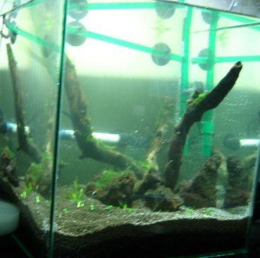 入れた水は何もしていない水道水です。レイアウト用の流木と溶岩石も一緒にいれました